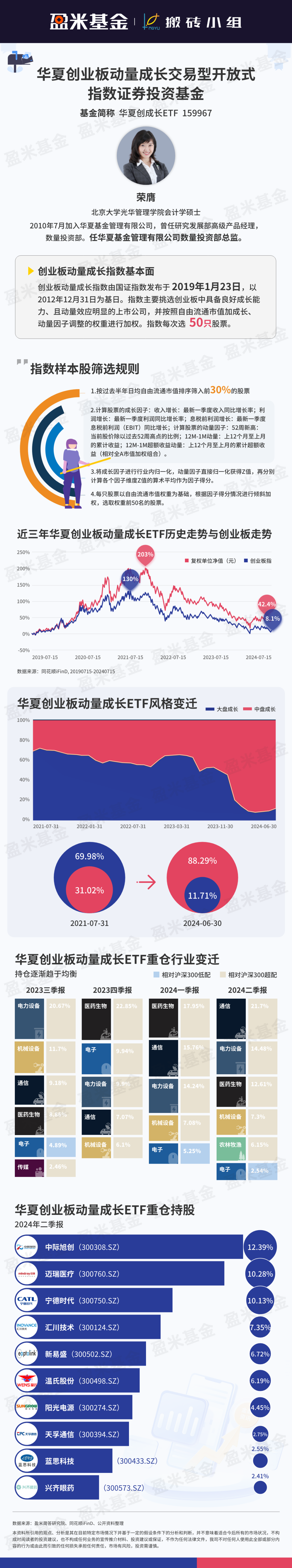 创业板成长ETF(159967)由于需要每个季度根据业绩和动量进行调整,所以持仓变化是会相对比较大的。截止至中报看,通信、医药、电力设备分别是指数的前三大一级行业,看了下中报状态基本面角度都没啥问题,就等着情绪回暖了,往后市场如果进入反弹周期值得重视。