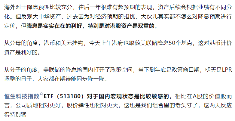 这一次的政策力度支持是很强的,强宏观下利好的是权重指数,这条线我们最看好的是港股,我们持续跟踪的恒生科技指数ETF(513180)今天大涨了6%,市场的共识一致的时候烈度是真得猛啊。。
