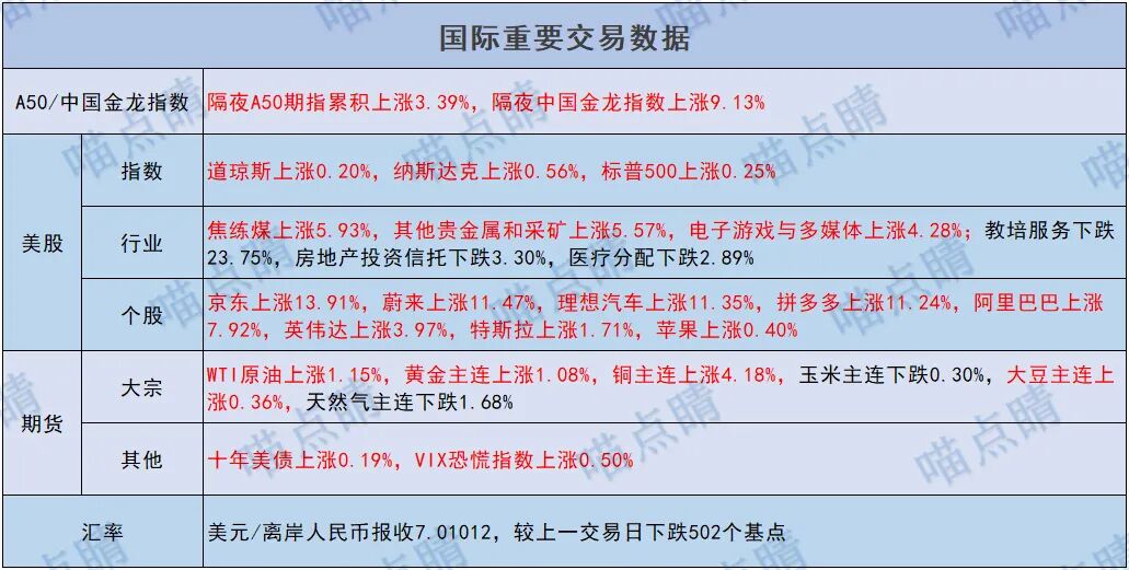 总之就是一个字,猛。。隔夜市场狂欢继续,A50在昨天收盘后,又涨了3.4%,纳指金龙也大涨9.1%,希望今天大A可以继续来接力。