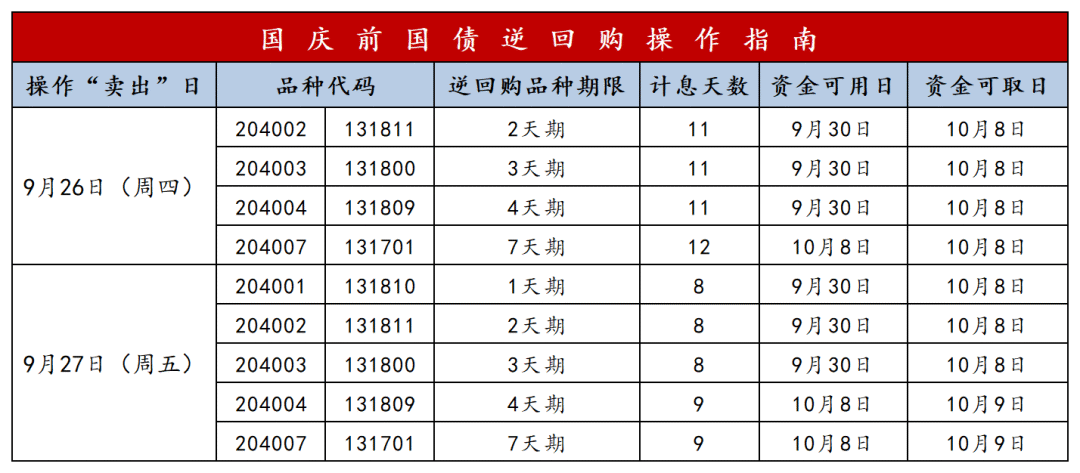 另一方面,如果今天不能在市场层面或事件层面有积极变化,那么场内资金就会琢磨落袋或者假期资金安排的问题了。而今天实际就是参与包括逆回购在内的投资工具,计息天数最大化的截止日。具体如下表,顺便也给有逆回购需求的同学参考下: