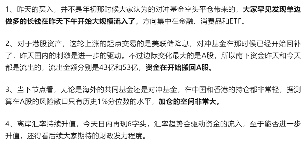 这回对这政策转变最敏感的是外资,我们在昨天的文章里正好跟大伙儿聊了(文末有相关文章链接),老外最近这2年都是牛市心态,情绪上是比我们内资好很多的,之前不买A股就是没有变化,现在出现顶层重大变化以后,就是猛干入场。