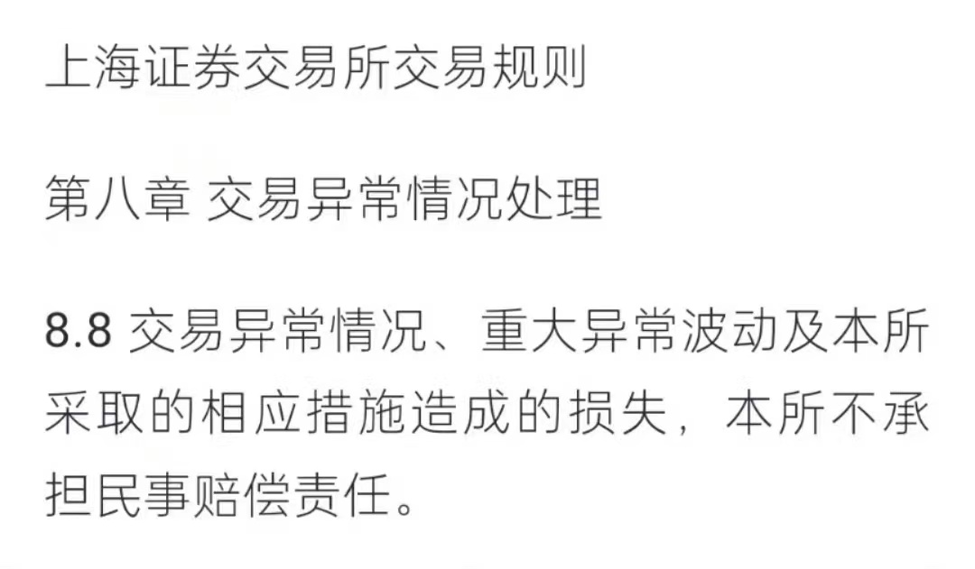 上交所今天搞这出就是挡人财路,很多人都在问能不能找上交所赔钱啊。小伙伴找到了上交所的交易规则,原来早早就说了:我出问题了别找我。。