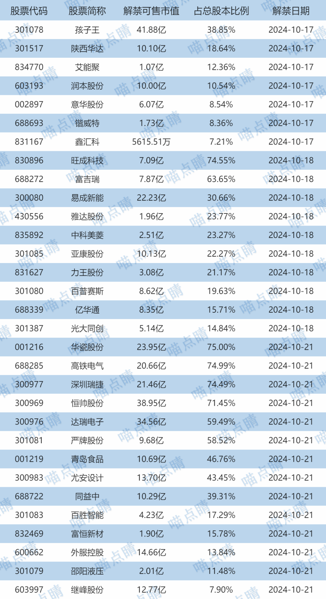 今天孩子王、陕西华达等有大额可售解禁。
