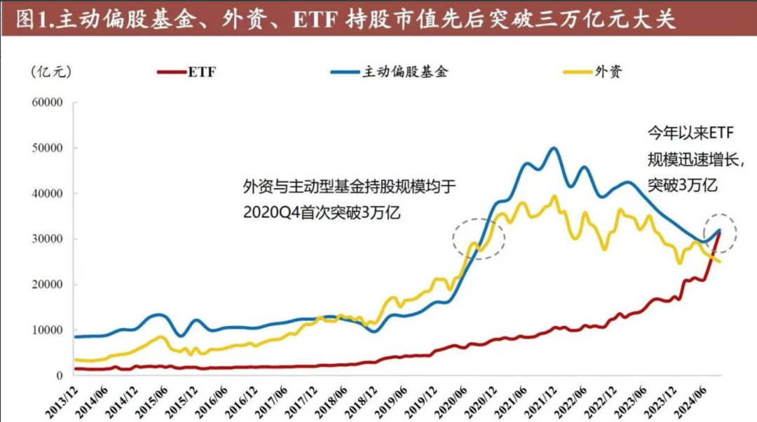而这回除了散户直接入场以外,最明显的增量资金就是ETF。目前ETF的规模已经超过3万亿了,昨天还看到有小伙伴说,ETF规模已经正式超过主动偏股基金的规模,这是一个非常重要的历史节点。