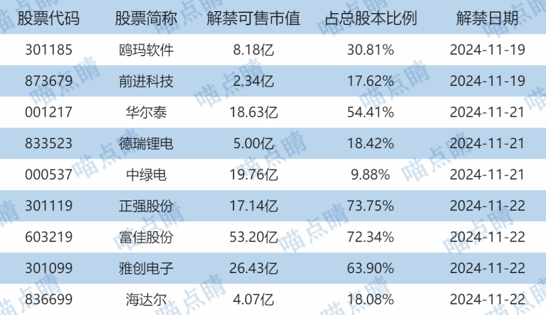 今天鸥玛软件、前进科技等有大额可售解禁。