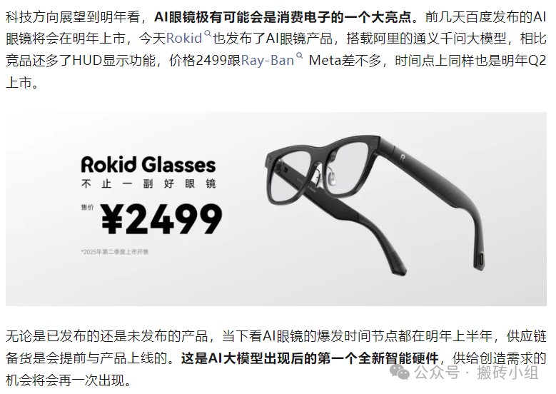 而AI眼镜这条线是明年消费电子里的重要新品,逻辑上是非常明确的了,之前聊过就不多说(文末有原文链接),就等明年上半年各大厂推出产品后再来看数据。