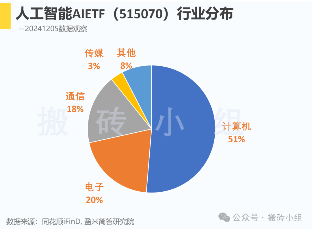 国内的AI应用集中在了软件和传媒两个一级行业里,看了一圈贝塔的机会,感觉还是人工智能AIETF(515070)比较合适,大部分的仓位在计算机,硬件也有相应的配置,总体均衡。