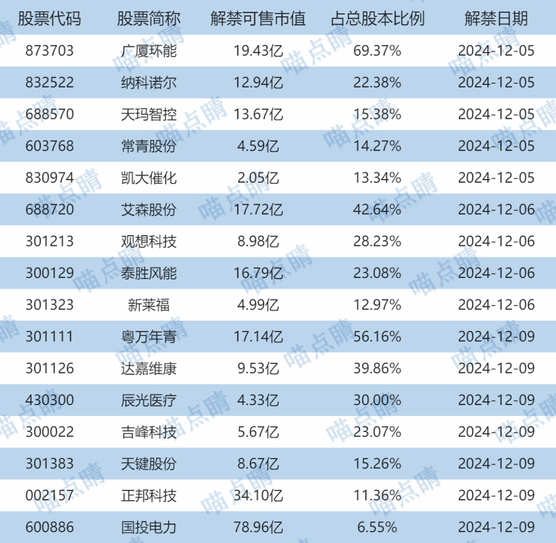 今天广厦环能、纳科诺尔等有大额可售解禁。