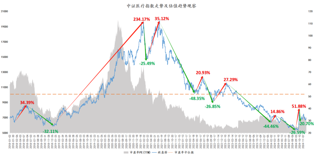粗线条一点看,有两个潜在的演绎路径对医药有利,一是如果行情延续展开,挖掘低位补涨方向的需求不断积累,势必溢出到洼地之中;二是医疗中蕴含了大量的顺周期因子,对于促进内需的政策脉络是买账的,另外就是国内外的降息周期,也是利于融资需求旺盛的创新药发展。