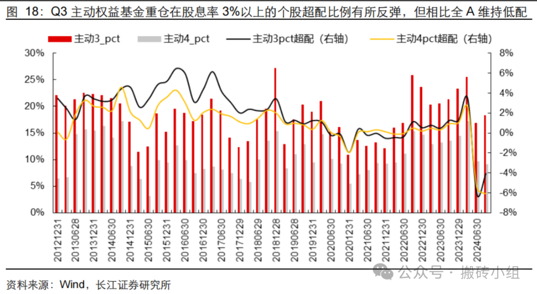 这一差异就造成了保险和公募对于红利类资产的态度不一致,特别是在有风险偏好提升行情的时候,公募群体对于红利类资产是没有什么忠诚度可言的。根据三季度的数据看,目前群体对于高股息资产是处于低配的状态,在红利资产这一块并不拥挤。