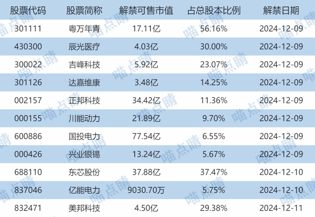 今天粤万年青、辰光医疗等有大额可售解禁。