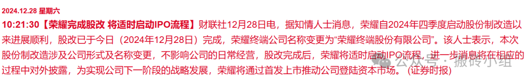 公司官宣说,股改在2024年12月28号正式完成,名称变更为荣耀终端股份有限公司。此次股份改制涉及公司形式和名称的变更,并不影响公司的市场经营。更重要的是,股改完成后,公司表示将适时启动IPO流程。