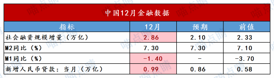 不出所料,大涨过后一般都有利好,昨天盘后一口气来了两个,第一个是金融数据表现不错,12月新增社融、信贷高于预期,M2符合预期,M1跌幅收窄。