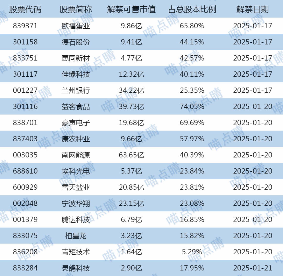 今天欧福蛋业、德石股份等有大额可售解禁。