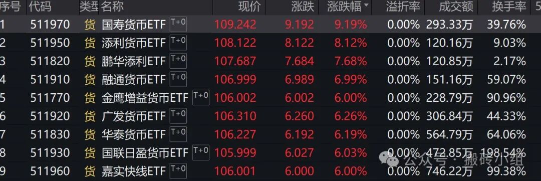 今天最让人震惊的就是货基etf冲击涨停,一个交易日完成6-7年的收益任务,在大A总能有刷新认知的神奇事件,套利干起来。