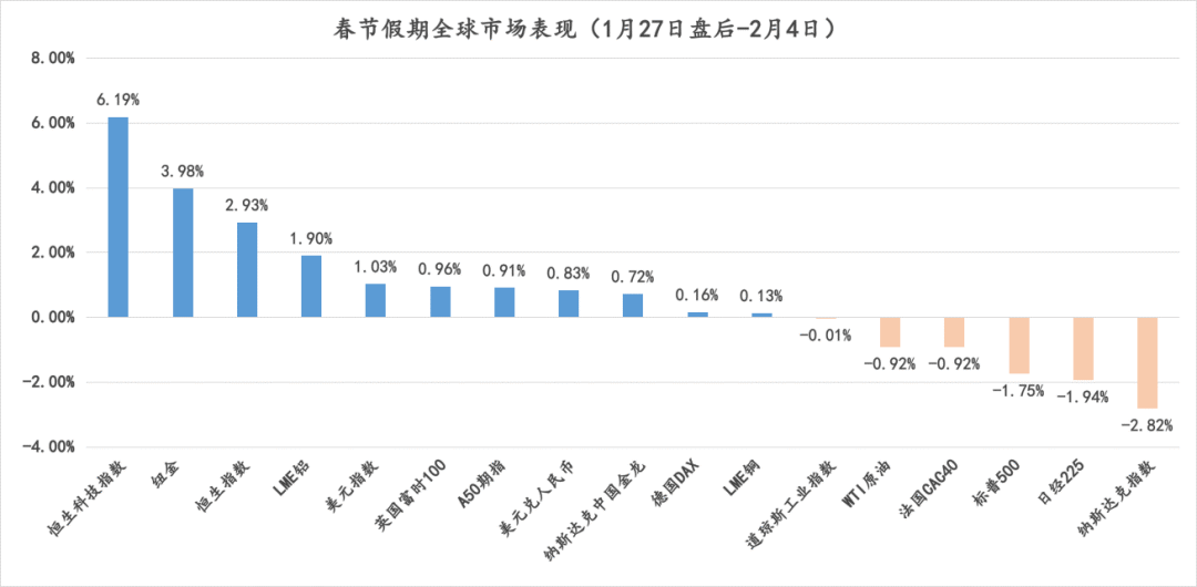 最后看下假期期间的市场表现,港股、金龙、A50等中国资产普遍表现不错,蛇年的开门红基本上稳了,祝大家今天以及今年都能有一个好收成!
