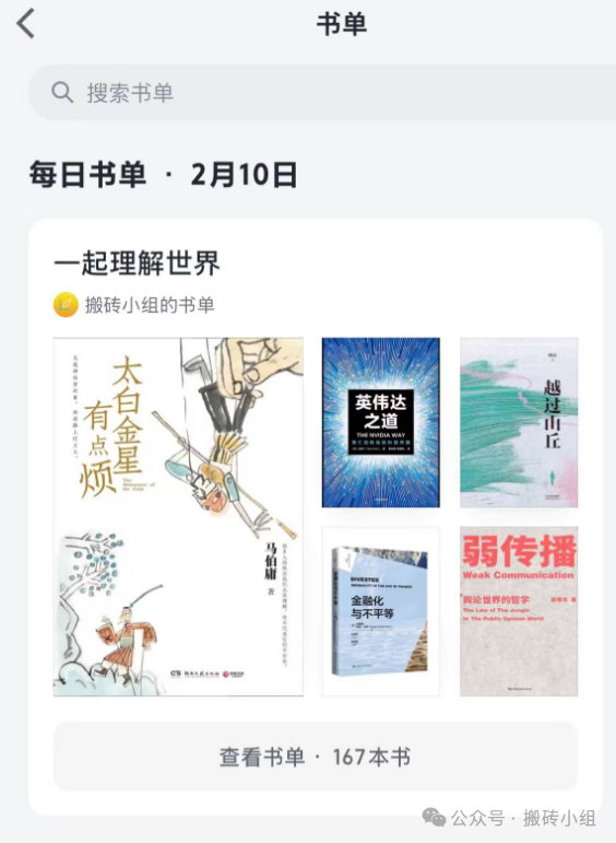 1、今天打开微信读书的时候,看到首页里推荐了我们在微信读书的书单,这个感觉还是蛮好的嘿嘿。一起理解世界这个书单是我们认为值得推荐的读物,包括自己读过的各类经典以及机构小伙伴的推荐,很建议大伙儿都去关注一下,书荒的时候去里面找找,相信都会有收获的~