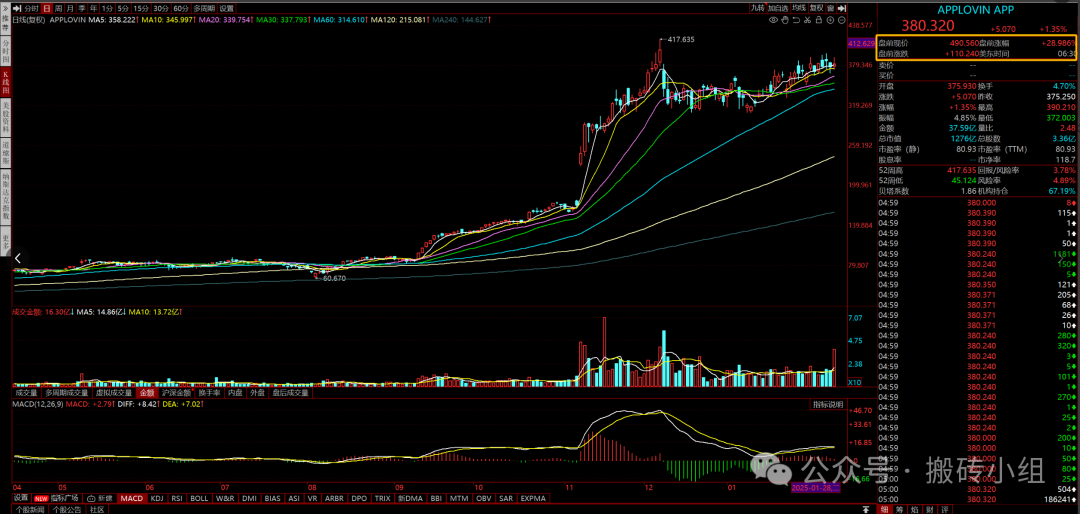 美股最近就是这个感觉,今天Applovin出了财报,四季度广告收入猛增73%,达到了近10亿美元,盘后直接跳涨30%,市场对于AI应用的定价是真得很乐观。