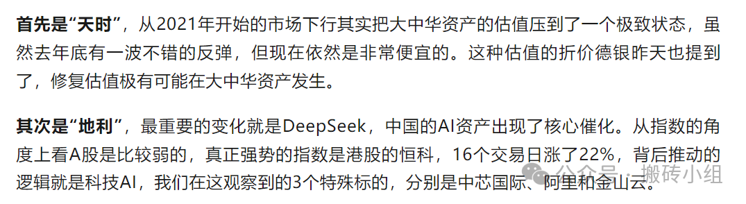 “地利”则是自身的技术突破,DeepSeek把成本降低以后确实让AI应用变得可以落地了,除此以外国内还有其他的模型在进步,比如我们昨天聊过阿里的大模型能力也非常强。