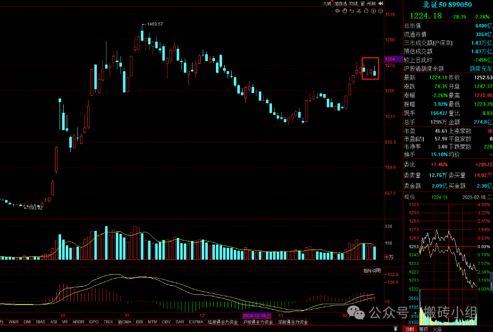 风偏向下的情况看咱的北证50就比较明显,今天日内波动是还蛮大的,日K线看已经横盘调整4天了,后面看有没机会接力市场的科技风偏情绪。