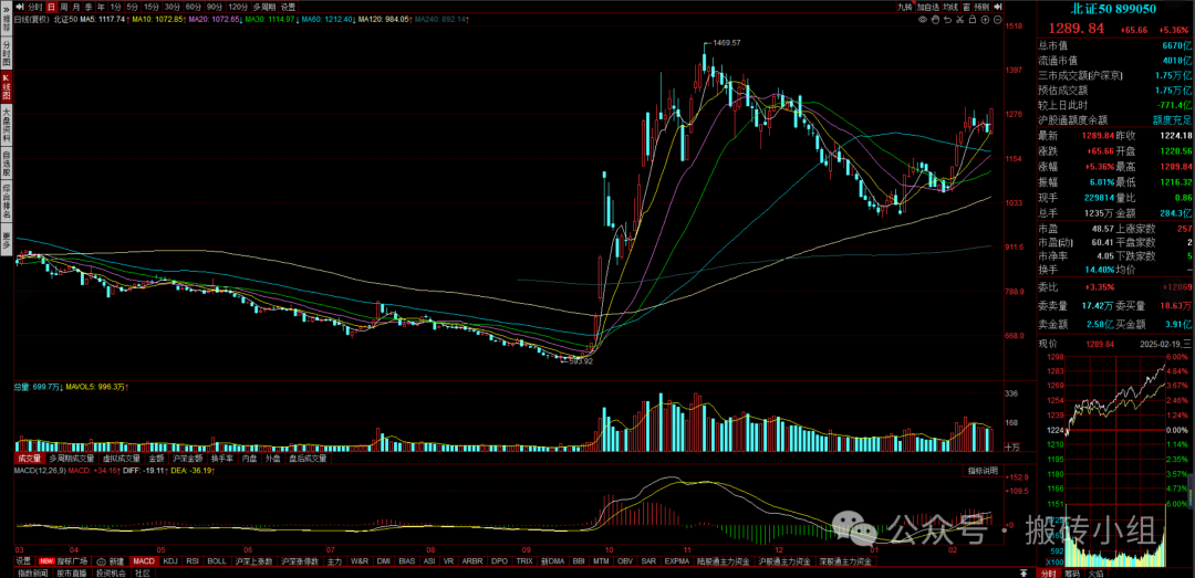 我们持仓里反应风偏的是北证50和红利,持有体验差别巨大。最近这段时间整个红利风格就是横着走,波动都没有,看走势很无聊;北证50这边则是弹性巨大,昨天跌2.2%,今天涨5.3%,从汇智乾坤开枪到现在已经接近9%了,立马到我们10%的第一目标位。