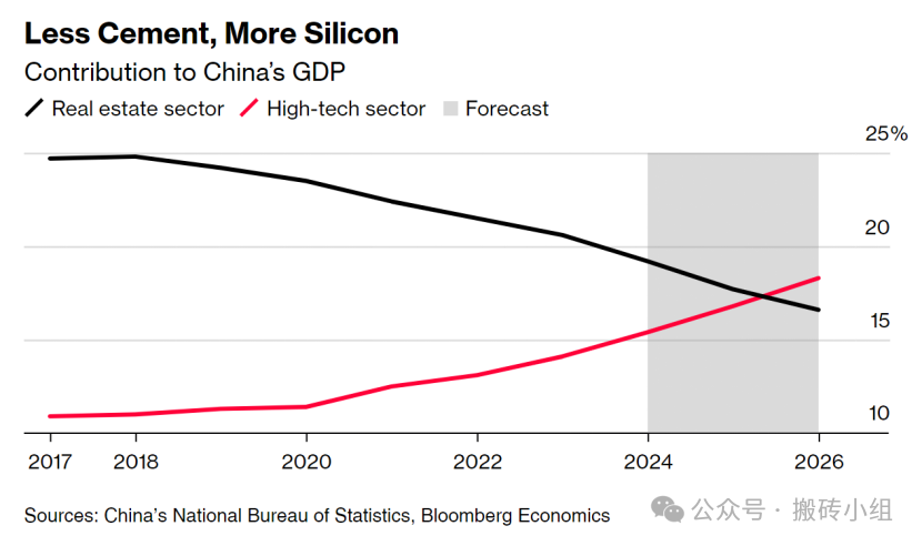 今天看到小伙伴发了一张彭博的统计,按照GDP贡献度来看,到2026年,房地产对中国GDP的贡献将低于17%,同期高科技行业将增长至18%,也就是到明年经济转型就要出现里程碑事件了!