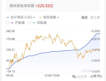 但今天整体看港股表现是非常硬的,恒科低开4%后反弹,盘中一度翻红了,收盘看也就跌1.5%,这种走法是蛮强势的。这一轮行情从资金观察的角度上看,外资流入的幅度不大,核心的买盘是内资,所以今天看到南下净买入再次达到220亿,大家都趁着利空下跌买买买。
